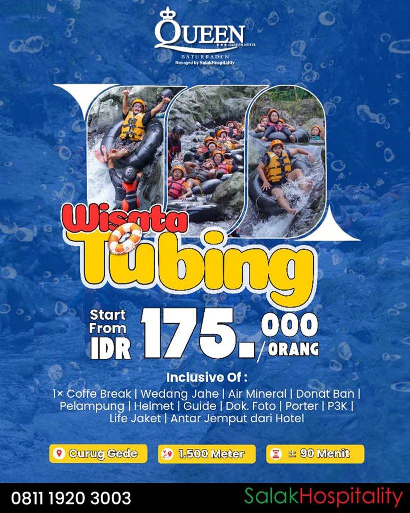 Dirancang sebagai bagian dari aktivitas outdoor unggulan hotel, Wisata Tubing dari Queen Garden Hotel Managed by Salak Hospitality memberikan pengalaman liburan aktif yang tetap mengedepankan kenyamanan dan keselamatan. Paket ini sudah termasuk berbagai fasilitas penunjang, seperti coffee break, wedang jahe hangat, air mineral, donat ban, helm, pelampung, life jacket, pemandu profesional, dokumentasi foto, porter, P3K, hingga layanan antar-jemput dari area hotel menuju lokasi tubing. Dengan standar keamanan yang terjaga, kegiatan ini cocok untuk keluarga, komunitas, maupun perusahaan yang ingin menikmati kebersamaan di alam terbuka.