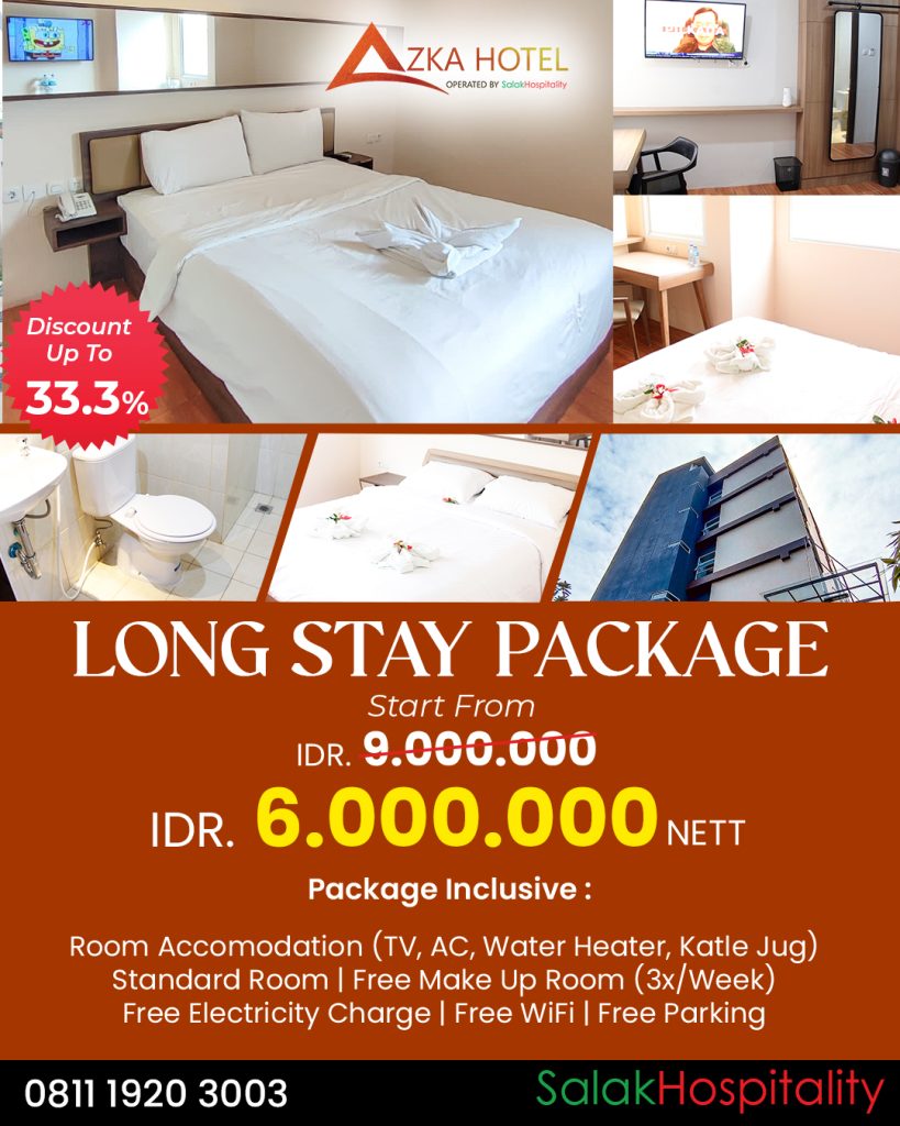 Melalui Long Stay Package dari Azka Hotel Managed by Salak Hospitality, tamu dapat menikmati berbagai fasilitas lengkap dalam satu paket hemat dengan potongan harga hingga 33,3%. Paket ini mencakup room accommodation di kamar standar yang telah dilengkapi TV, AC, water heater, serta kettle jug. Selain itu, tamu juga mendapatkan layanan free make up room sebanyak 3 kali per minggu, bebas biaya listrik, akses Wi-Fi gratis, serta fasilitas parkir tanpa biaya tambahan. Dengan kombinasi fasilitas tersebut, paket ini menjadi solusi ideal bagi tamu yang menginginkan kenyamanan tinggal layaknya di rumah dengan biaya lebih efisien.