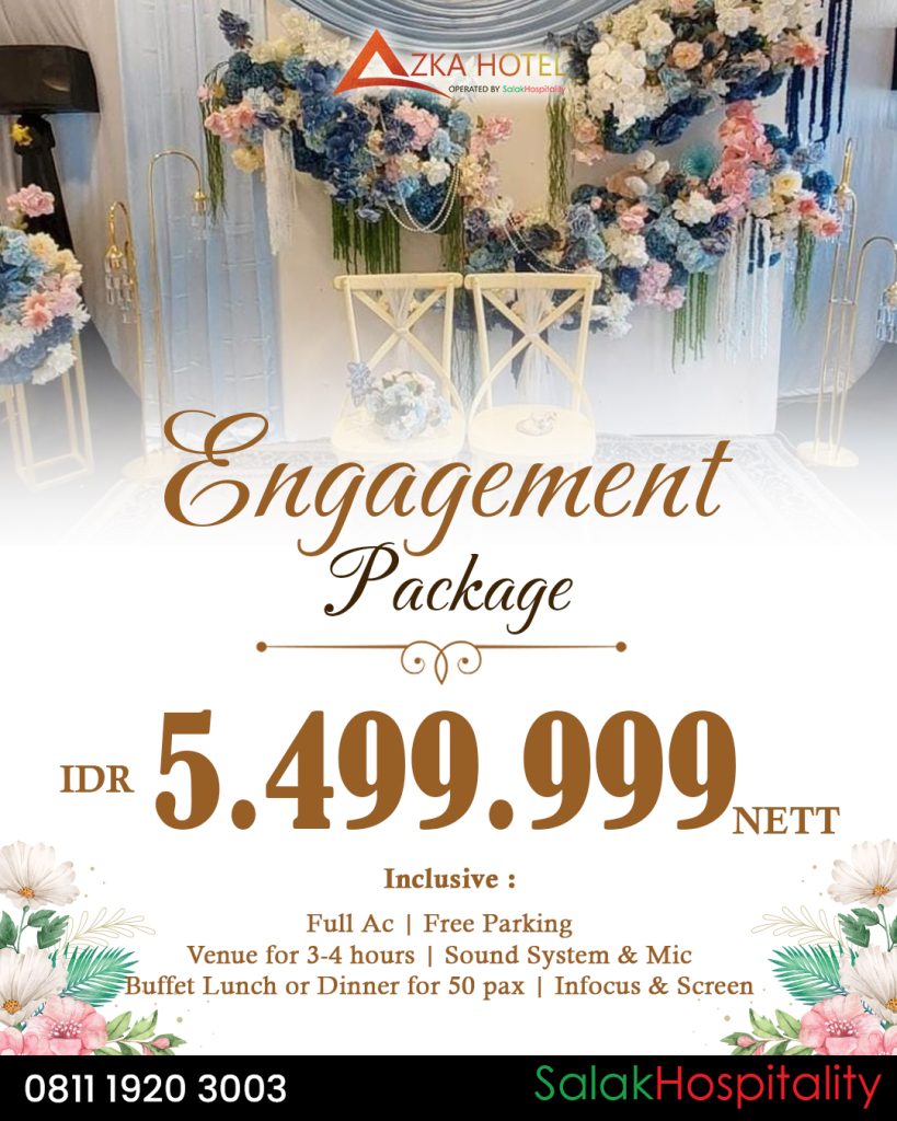 “Kami melihat banyak pasangan menginginkan momen engagement yang sederhana namun tetap berkelas. Karena itu, paket ini kami rancang agar seluruh kebutuhan acara bisa terpenuhi dalam satu tempat,” ungkap Bapak Burhan, Manager Azka Hotel.