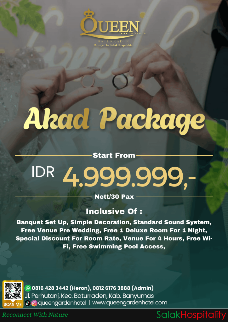 “Akad Package kami hadir sebagai solusi praktis dan elegan bagi pasangan yang ingin fokus pada kekhidmatan prosesi akad tanpa harus repot mengatur banyak detail. Dengan suasana alam Baturraden yang sejuk dan hijau, momen sakral menjadi lebih bermakna dan berkesan,” ujar Ibu Ayi, Manajer Queen Garden Hotel.