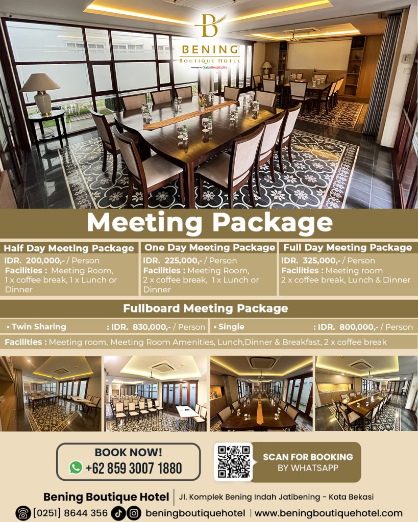 Bekasi, November 2025 — Bening Boutique Hotel Managed by Salak Hospitality resmi meluncurkan Paket Meeting terbaru yang dirancang untuk memenuhi kebutuhan perusahaan, komunitas, dan organisasi yang membutuhkan ruang pertemuan nyaman dan privat. Berlokasi strategis di Jatibening, Bekasi, hotel ini menawarkan tiga pilihan paket meeting mulai dari Rp200.000 per orang, menjadikannya pilihan ideal bagi kegiatan bisnis maupun agenda profesional lainnya.
