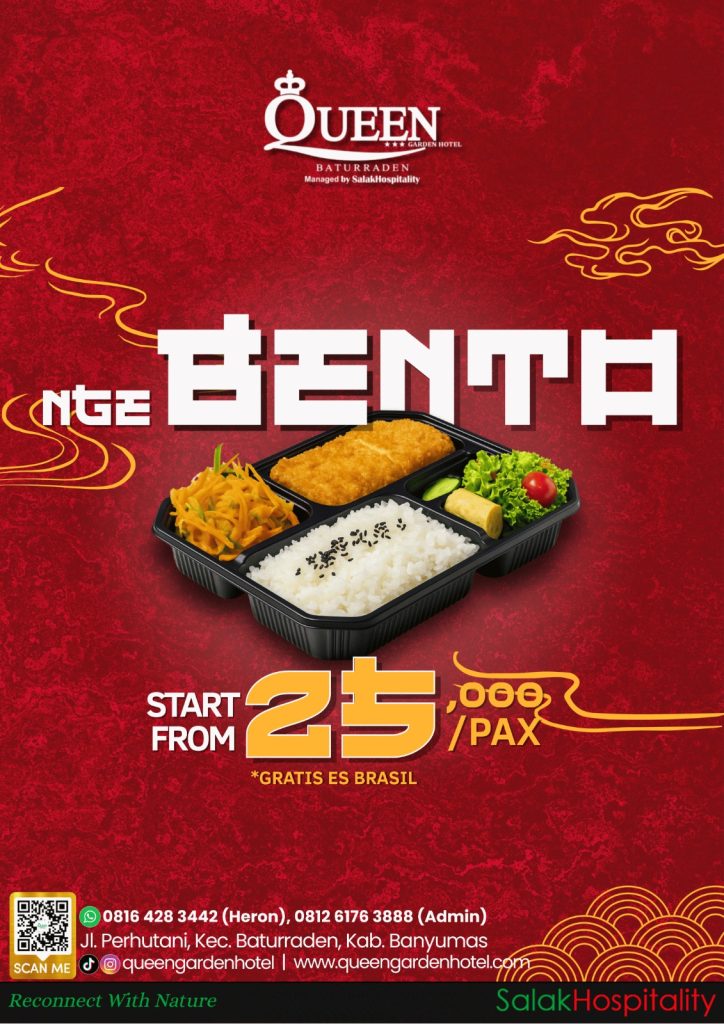Informasi lebih lanjut mengenai Nge-Bento di Queen Garden Hotel Baturraden dapat diperoleh melalui Corporate Contact 0811-1920-3003 atau dengan mengunjungi website resmi www.salakhospitality.com.