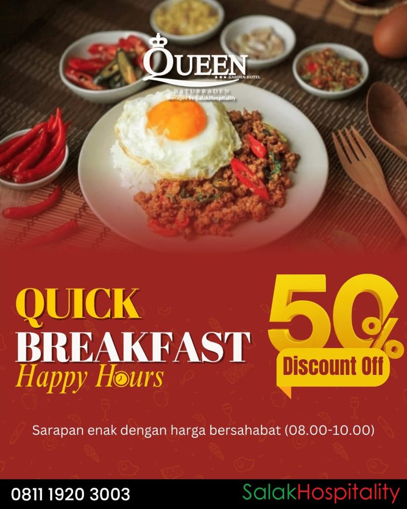 Untuk informasi lebih lanjut mengenai program Quick Breakfast dari Queen Garden Hotel Managed by Salak Hospitality, silakan menghubungi Corporate Contact di 0811-1920-3003 atau kunjungi website resmi www.salakhospitality.com. Nikmati sarapan hemat dengan cita rasa istimewa di tengah keindahan alam Baturraden.