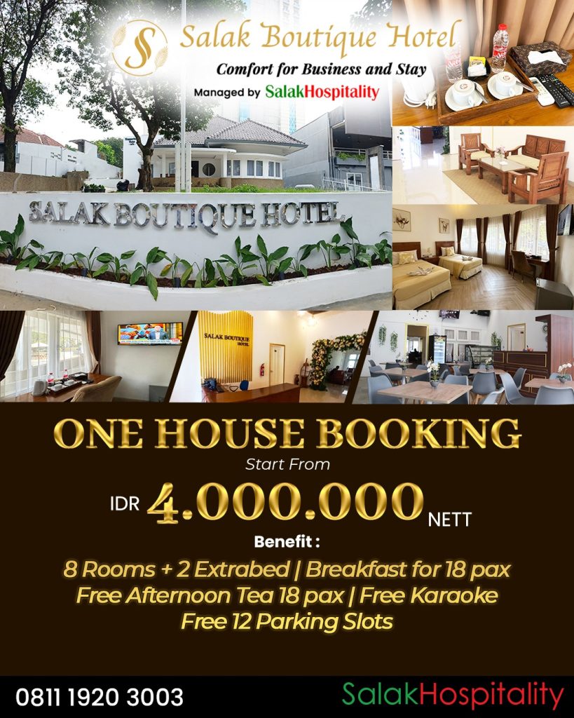 Melalui program One House Booking dari Salak Boutique Hotel managed by Salak Hospitality, tamu dapat menikmati seluruh fasilitas hotel secara eksklusif dalam satu waktu. Paket ini mencakup 8 kamar lengkap dengan tambahan 2 extrabed, serta fasilitas sarapan untuk 18 orang, complimentary afternoon tea untuk 18 orang, layanan karaoke gratis, dan 12 slot parkir yang luas dan aman. Konsep ini memberikan pengalaman layaknya memiliki “rumah pribadi” dengan standar layanan hotel profesional.