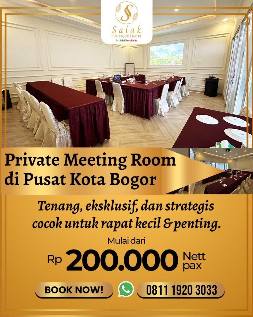 “Kami memahami pentingnya suasana yang kondusif untuk produktivitas dan fokus dalam setiap pertemuan. Karena itu, kami menghadirkan Private Meeting Room dengan layanan personal dan lokasi strategis di pusat Bogor,dengan harga yang terjangkau dan fasilitas lengkap, paket ini menjadi pilihan ideal bagi korporasi, lembaga, maupun profesional yang mencari kenyamanan maksimal dalam setiap agenda bisnisnya.” ujar Edy, perwakilan Salak Boutique Hotel by Salak Hospitality.
