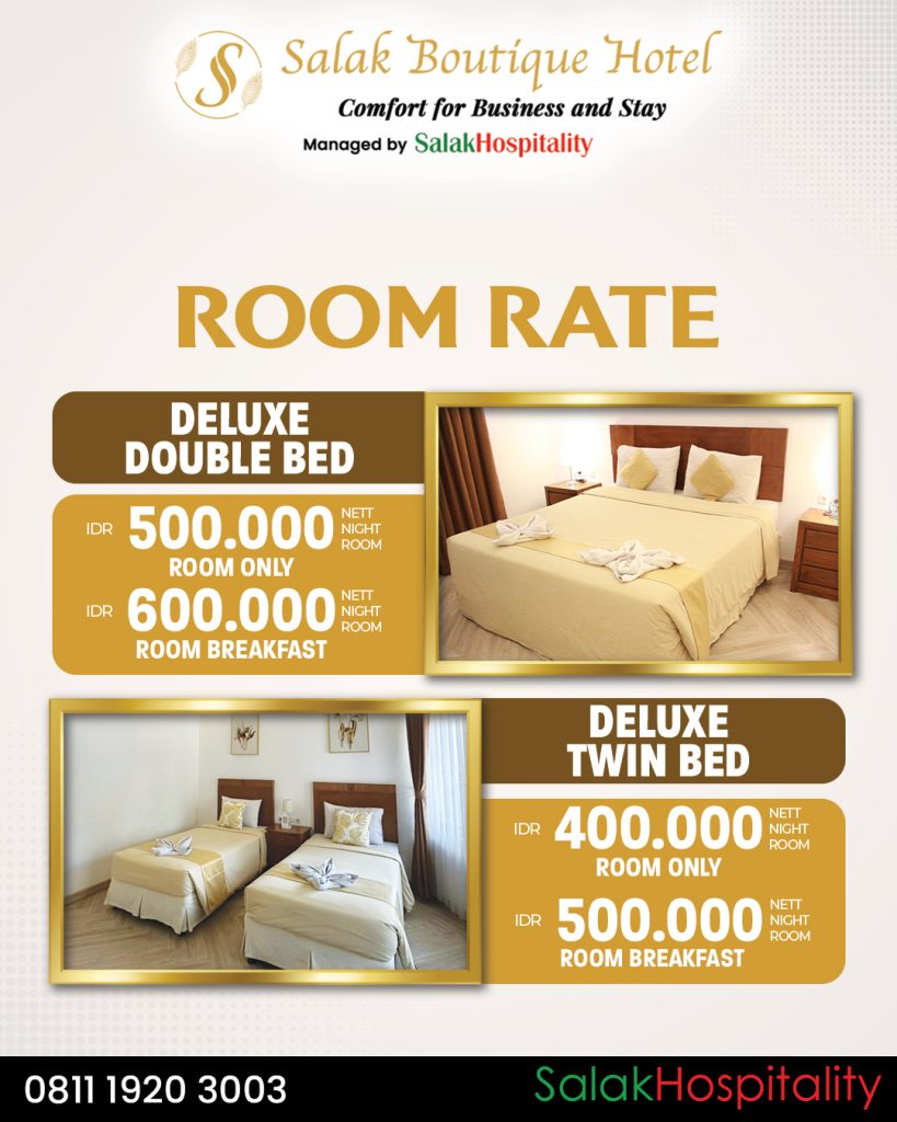 Untuk informasi lebih lanjut dan reservasi Room Rate dari Salak Boutique Hotel managed by Salak Hospitality, silakan menghubungi Corporate Contact di 0811-1920-3003 atau kunjungi website resmi www.salakhospitality.com.