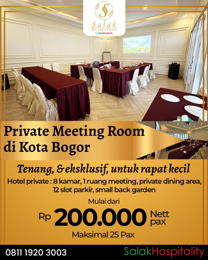 Dengan kombinasi lokasi strategis, suasana privat, dan pelayanan profesional, Salak Boutique Hotel menjadi pilihan tepat untuk menghadirkan meeting yang lebih produktif dan berkelas di Kota Bogor. Untuk informasi lebih lanjut dan reservasi, silakan menghubungi Corporate Line 0811-1920-3003 atau kunjungi www.salakhospitality.com.