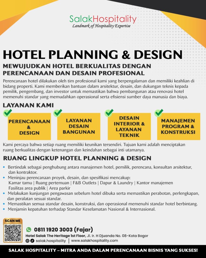 BOGOR — Salak Hospitality menghadirkan layanan Hotel Planning & Design sebagai solusi profesional bagi pemilik hotel, pengembang properti, serta investor yang ingin merencanakan pembangunan maupun pengembangan hotel secara terstruktur. Layanan ini bertujuan memastikan setiap proyek hotel dirancang dengan perencanaan yang matang, desain yang fungsional, serta sistem operasional yang mendukung keberhasilan bisnis hospitality.