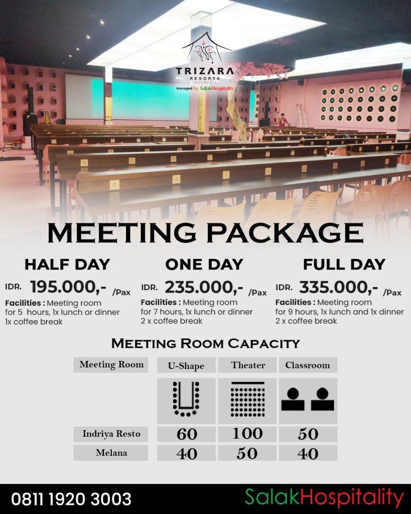 Program meeting ini tersedia dalam tiga pilihan durasi yang fleksibel. Paket Half Day berdurasi lima jam ditawarkan mulai dari Rp195.000 per orang, sudah termasuk penggunaan ruang meeting, satu kali makan (siang atau malam), dan satu kali coffee break. Untuk kebutuhan yang lebih panjang, tersedia paket One Day selama tujuh jam seharga Rp235.000 per orang dengan fasilitas ruang meeting, satu kali makan, dan dua kali coffee break. Sementara itu, paket Full Day berdurasi sembilan jam dibanderol mulai Rp335.000 per orang, mencakup ruang meeting, makan siang dan makan malam, serta dua kali coffee break.